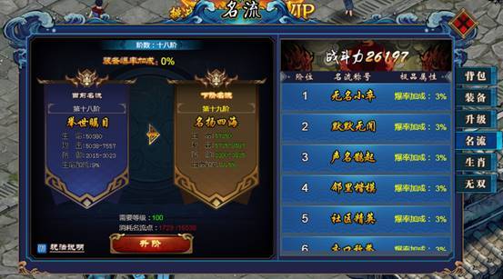 升级名流可提升属性加成和爆率加成;